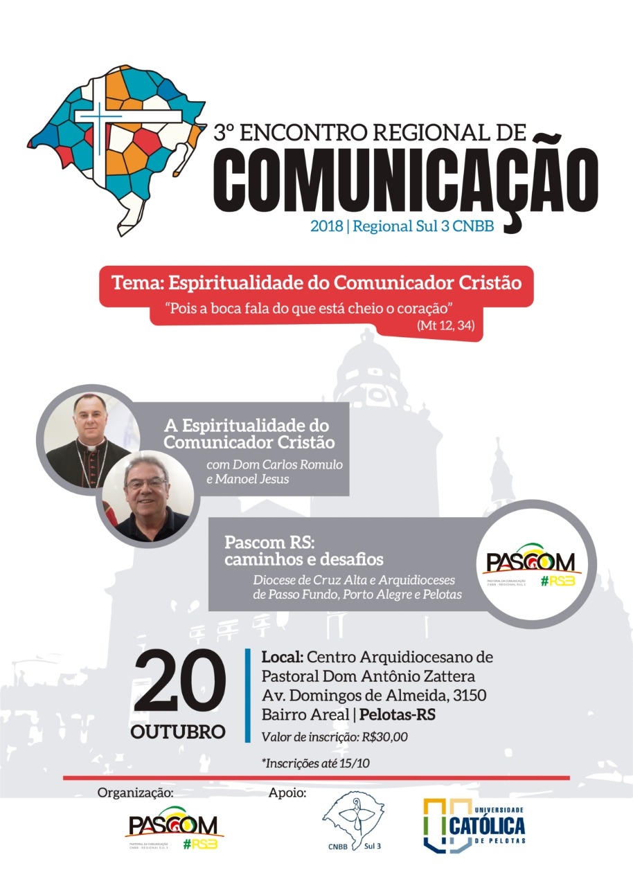 Será realizado dia 20 de outubro, em Pelotas, o 3º Encontro Regional de Comunicação do Regional Sul 3 da Conferência nacional dos Bispos do Brasil (CNBB).