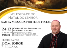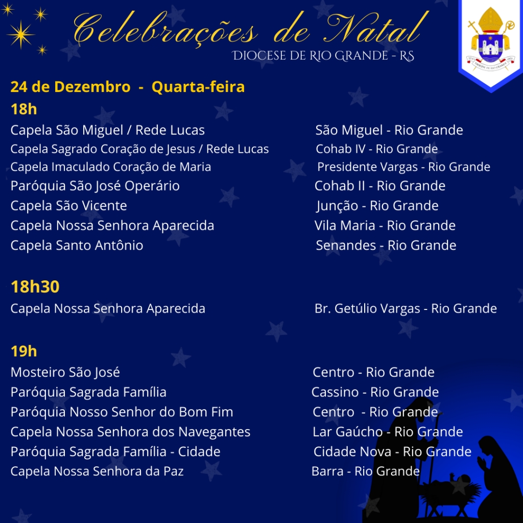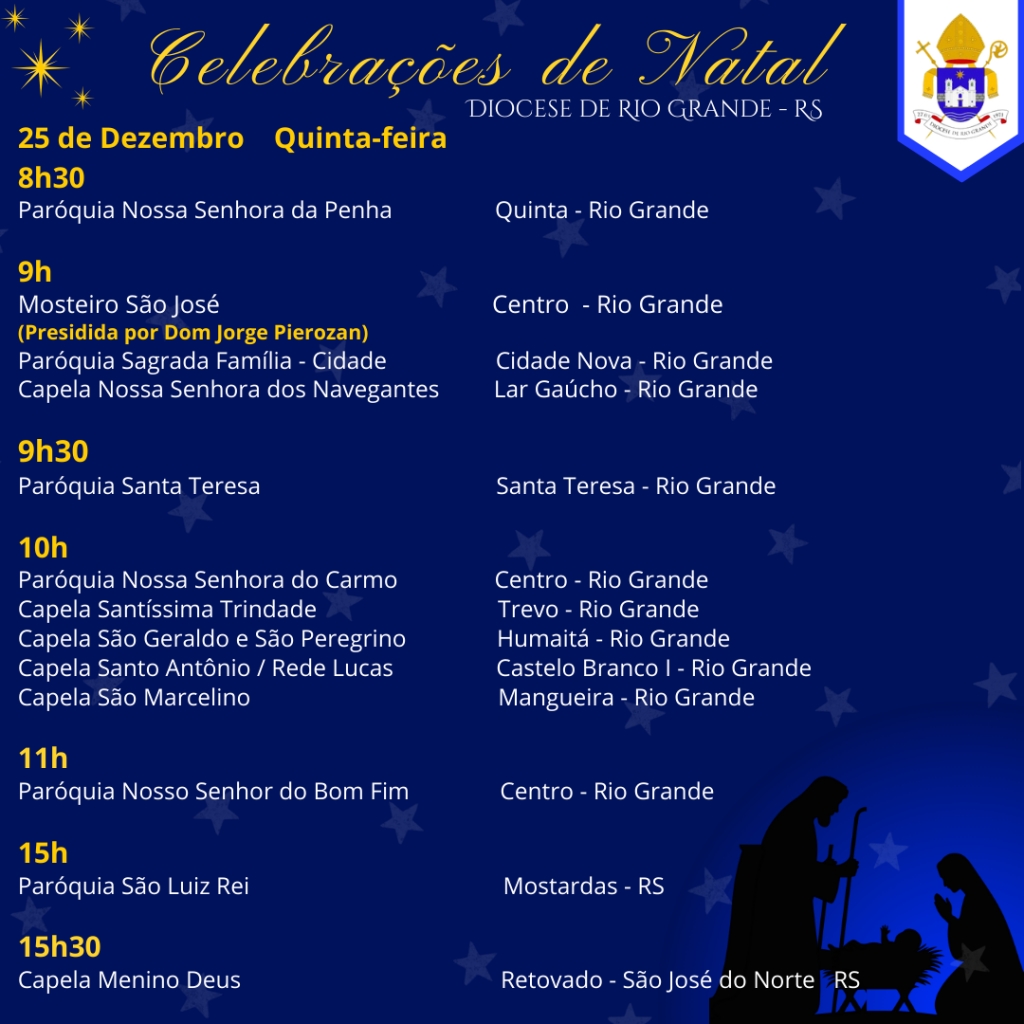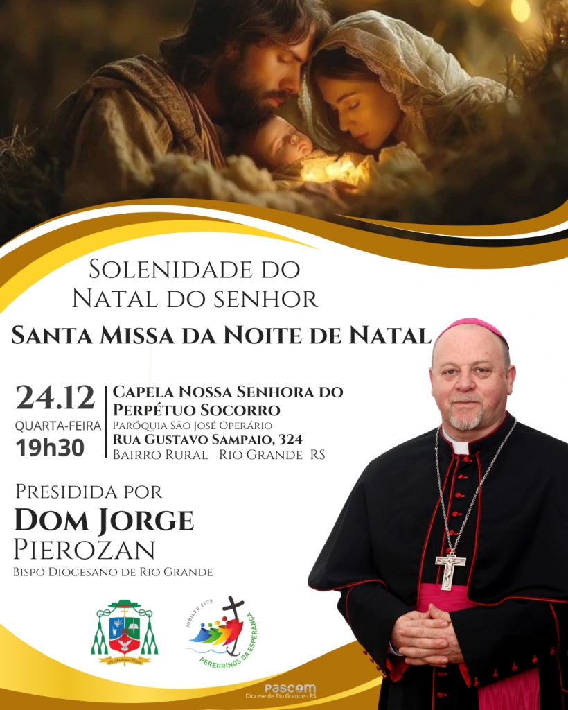 Convidamos com carinho todas as famílias, fiéis e visitantes a participarem das Celebrações de Natal, celebradas em diversos horários e locais, para juntos proclamarmos a alegria do Natal, celebrar a vida e renovar o compromisso com o Evangelho, a paz e a esperança que Cristo nos traz.